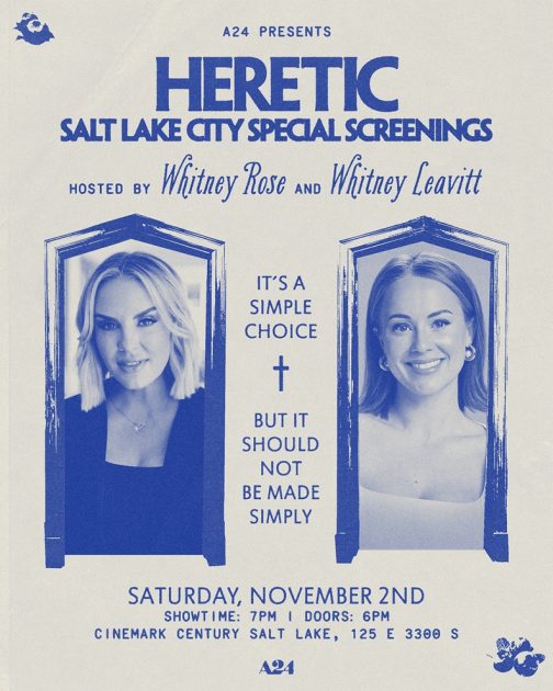 Whitney Rose of The Real Housewives of Salt Lake City & Whitney Leavitt of The Secret Lives of Mormon Wives invite you to a special screening of Heretic this Saturday, November 2, at Cinemark Century Salt Lake at 7pm (doors open at 6pm). Please arrive early as seating is on a first-come, first-served basis and is not guaranteed.